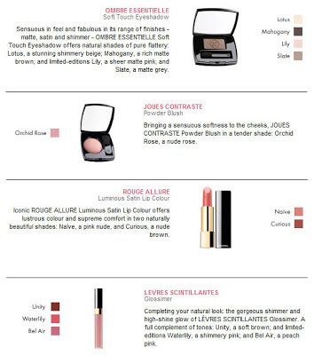 The theme for this collection is: “A quintessential makeup collection of universally wearable, natural colours designed to enhance and flatter the face. . . and ensure a woman’s best look is naturally her own.” Les Naturels de Chanel includes the following items: