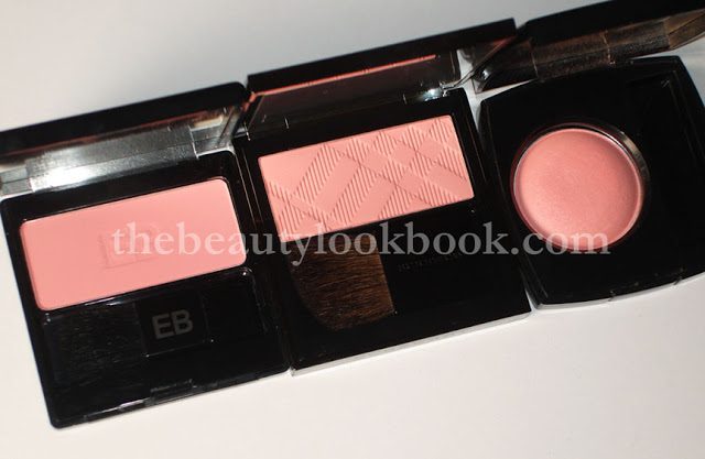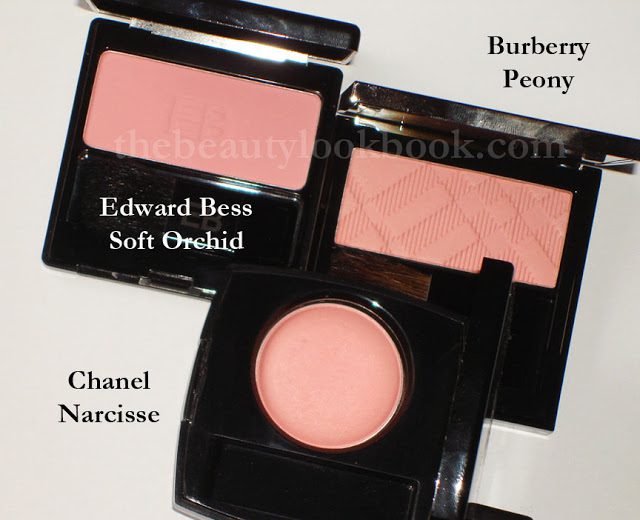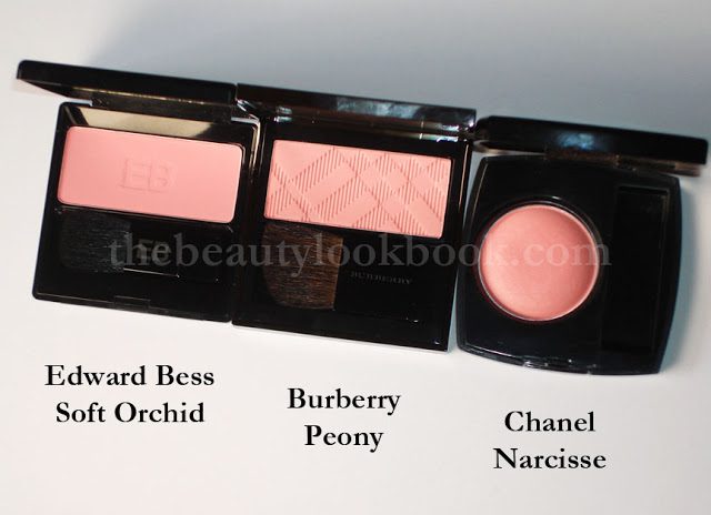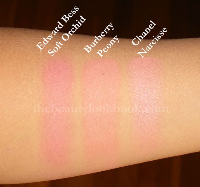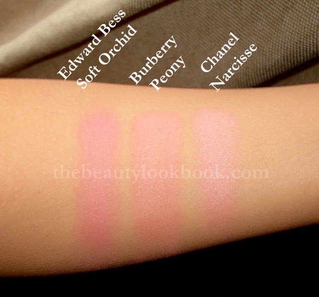 Compared to a few other pinks, they look strikingly similar to Edward Bess’s Soft Orchid and Chanel Narcisse. The difference is noticeable once on the skin. EB Soft Orchid is cooler toned and I also find this one softer/sheerer in finish. Chanel Narcisse has a more powdery-looking finish because of the shimmer in it. I would say that Burberry’s Blush finish seems similar to that of Chanel Narcisse (the US version). Out of all my Chanel blushes, for some reason I find Narcisse the softest. All are swatched over a mixture of MAC Prep & Prime, Armani Lasting Silk 5.5+6.5.