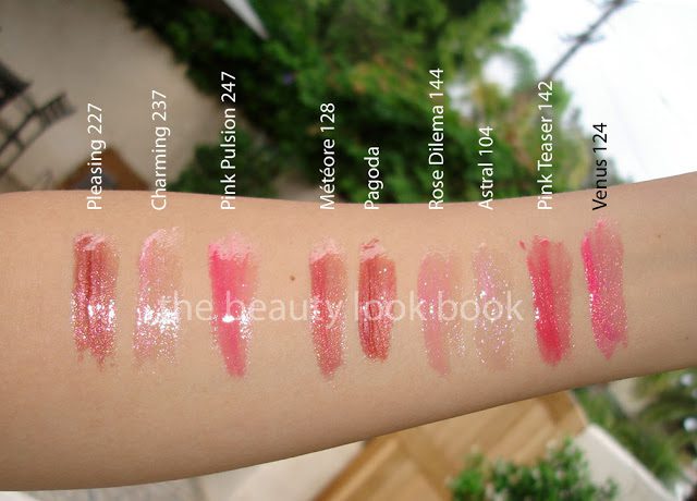 The new glossimers released this holiday include Pleasing 227 (complex cinnamon brown pink sparkle), Charming 237 (sparkling light pink) and Pink Pulsion 247 (sheer but sparkling hot pink). All are gorgeous and I think you’ll love these if you don’t mind shimmer. These are slightly-thick but not super sticky in typical Chanel style. I personally love glossimers and while these are very pretty I have noticed a few things that while slight, still have me thinking hmmmmm …