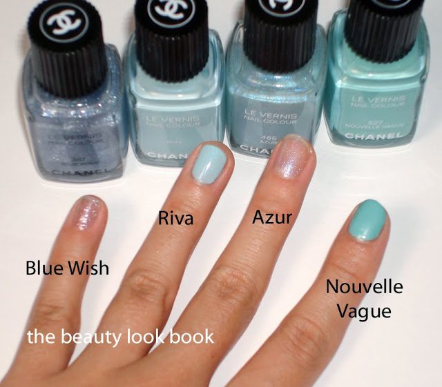 All swatched with 3 coats, you can see Riva is lighter and softer than Nouvelle Vague. Swatched next to each other, Nouvelle Vague almost looks blue-green.