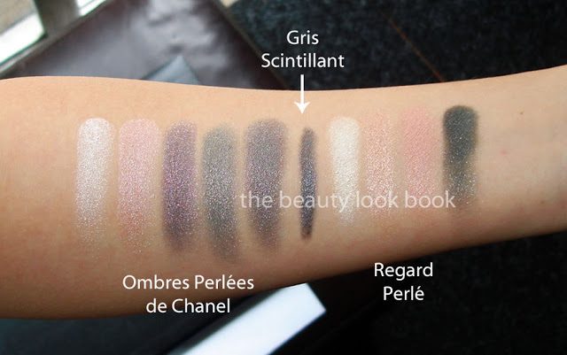I couldn’t find a dupe, but some wanted to know how it compared to a few other quads by Chanel. I didn’t have time to swatch them, but the textures/finishes are typical of the usual Chanel quads: soft, silky smooth, medium pigment, soft shimmer, beautiful sparkle. Here is Regard Perlé next to Winter Nights and Murano. To me, the runway looks from the Spring 2011 show seemed more like Murano on the eyes rather than Regard Perlé.