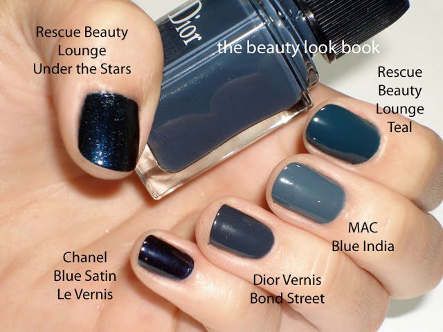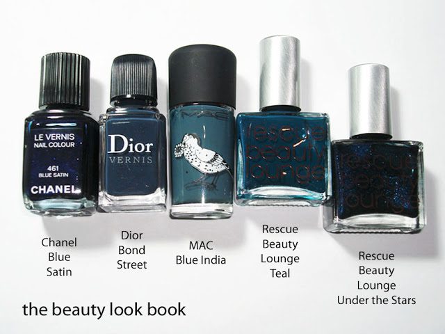 L to R: Chanel Blue Satin, Dior Bond Street, MAC Blue India, Rescue Beauty Lounge Teal, Rescue Beauty Lounge Under the Stars