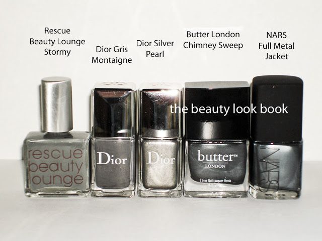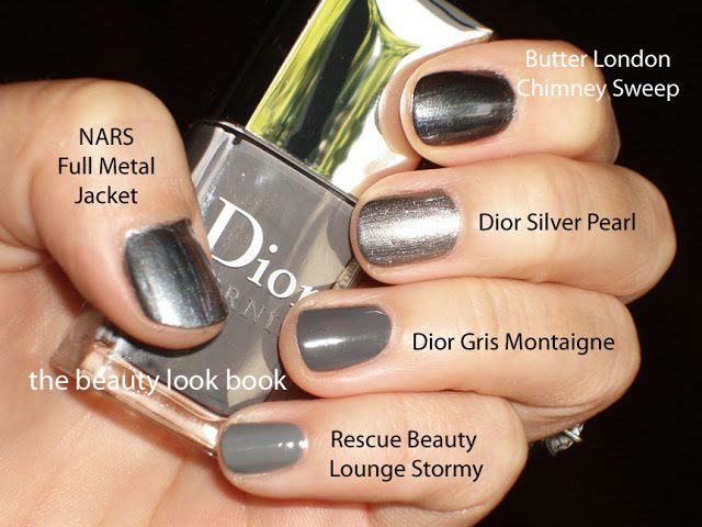 L to R: Rescue Beauty Lounge Stormy, Dior Gris Montaigne, Dior Silver Pearl, Butter London Chimney Sweep and NARS Full Metal Jacket