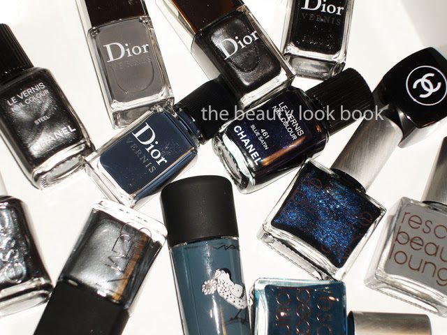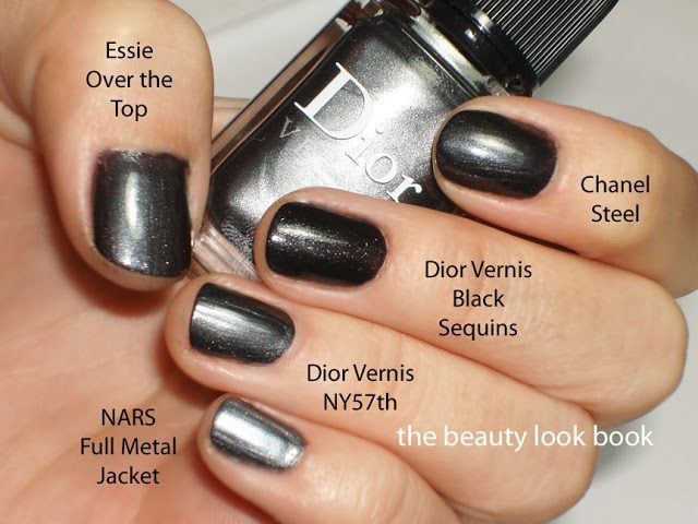 L to R: NARS Full Metal Jacket, Dior NY57th, Dior Black Sequins, Chanel Steel, Essie Over the Top