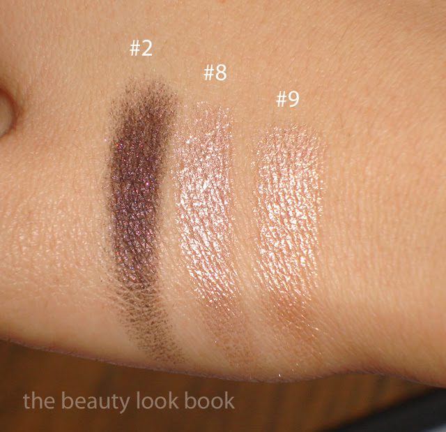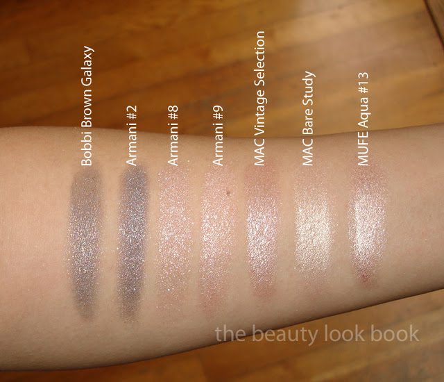 Comparisons of the silvery and lighter colors below. Bobbi Brown Galaxy is warmer and sheerer compared to #2 Pulp Fiction. For the lighter shades I recommend clicking below for larger viewing. MAC Vintage Selection is more pinkish/mauve, MAC Bare Study almost looks like a white gold compared to #8/#9, MUFE Aqua #13 is even more metallic and pigmented but lacks the complex multi-color sparkles the Armani have which makes it more of a silvery-champagne finish.
