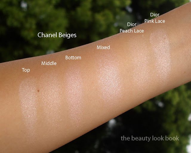 This morning I applied Chanel Beiges as a highlighter on the cheeks over Chanel Rose Petale Blush. It lasted all day and well into the evening. The powder underneath has a unique texture that’s almost creamy, but not quite. After swatching all three shades, I found that they all look fairly similar on my skin. Blending them together doesn’t really change the effect. What I see is a pale pearly highlighter with a beautiful shimmer. On tanned/darker skins this may show up as a white frost – but only because of the contrast from the pale powder to a darker skin tone. I think if I get a few shades darker this might be too light for the face. For the eyes though, I think it would suit a number of skintones. It makes the eyes just glow with the most beautiful refined shimmer and sparkle. I adore it!
