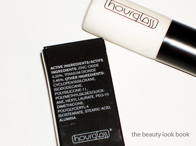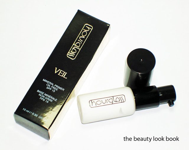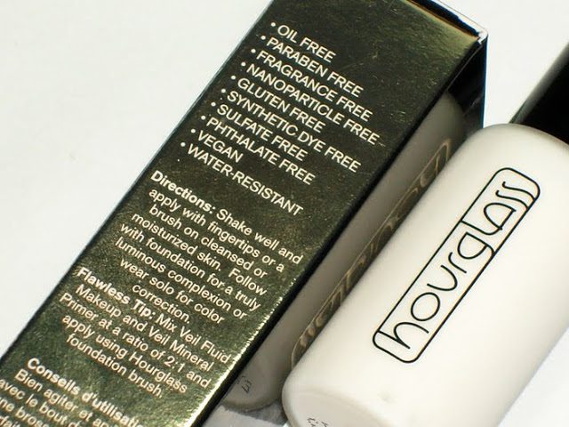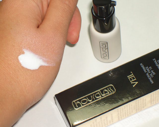 Over the years I’ve discovered a number of excellent foundation primers such as MAC Prep & Prime, Chanel Base Lumiere, Le Blanc de Chanel, Smashbox Photofinish, NARS (the original version) and Guerlain Meteorites Light-Diffusing Perfecting Primer. I’m always on the hunt for tips and tricks that will help me achieve that flawless foundation finish. Primers are often key to achieving a natural even look. Considering the fact that I have sensitive skin, I’ve had quite a bit success in finding good primers from numerous brands, however, few have managed to keep my makeup looking fresh all day from morning until late afternoon. I was recently sent a sample package from Hourglass and over the past week have been putting the Veil Mineral Primer to the test. The primer comes in 2 sizes at Sephora: 0.33 oz for $17 and a larger size of 1.00 oz for $52 (both with pump dispensers). I received the smaller size to sample. The product comes in a liquid formula with a white tint. The satiny finish is supposed to smooth out the appearance of your skin, absorb oil and minimize pores. From the swatch below you can see that the product lightened my skin slightly.