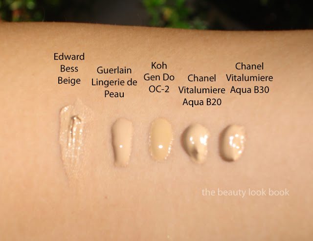 Here is OC-2 pumped next to Edward Bess Beige, Guerlain Lingerie de Peau 03 and Chanel Vitalumiere Aqua in B20 and B30. I was initially matched to Chanel B20 but is now clearly too light for me (will have to save for winter). I did not blend these out because I could not photograph them fast enough before the liquids dried and then darkened on my arm. Two things to take into consideration: 1) the inside of my arm is lighter than my face and 2) my skin is weird because so many different colors of foundation work on my skin (as long as it doesn’t have a pinkish base).