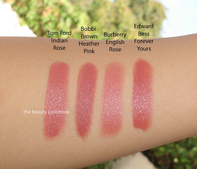 Below are a few comparisons to Bobbi Brown Heather Pink (which is more brown/plum), Burberry English Rose (which is lighter and more mauve), and Edward Bess Forever Yours (which is a darker plum).