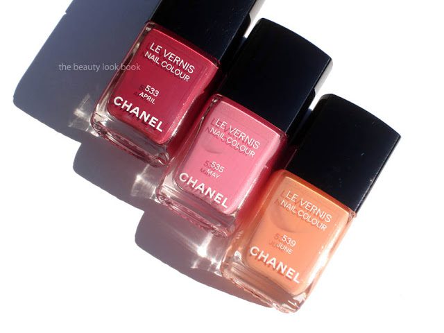 Chanel Spring has started to trickle into stores in the US. Nordstrom should be receiving their items any day now and Neimans already has the product instore at counters (most of the items have arrived). Chanel.com just launched the spring items online. Of course I could not resist the three new Le Vernis Nail Colours in April, May and June – all cream non-shimmer shades with smooth rich coverage. Although these shades do not appear to be special or unique, I find that Chanel once again has mixed the perfect amount of color to create shades that are amazingly beautiful. Lined up together they remind me of a sunset.