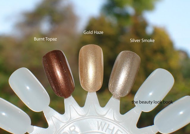 The colors, swatches and comparisons. Left to right: Burnt Topaz, Gold Haze & Silver Smoke: