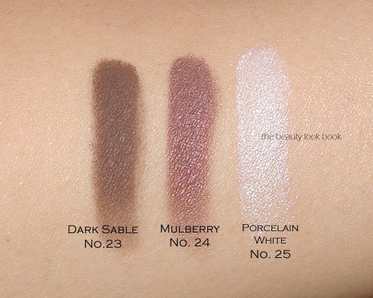 - three new eyeshadows Dark Sable No. 23, Mulberry No. 24, Porcelain White No. 25 ($29 each for 2.5 g/ .088 oz, made in Italy)
