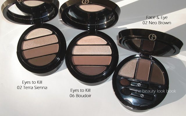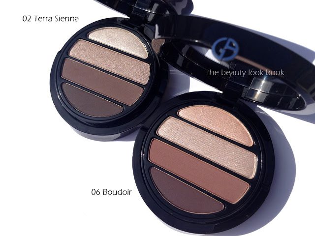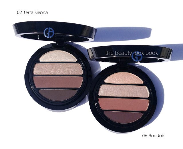 Giorgio Armani has reformulated and repackaged their eyeshadow quads into eight new color options. The new Eyes to Kill Eye Palettes ($59 each) come with a double tiered black lacquered compact. The top layer has four eyeshadows, underneath there are two sponge-tipped applicators. At the Armani counter it was hard to not to fall in love with them all. I decided to try two safety neutrals first: 02 Terra Sienna and 06 Boudoir. The packaging below: