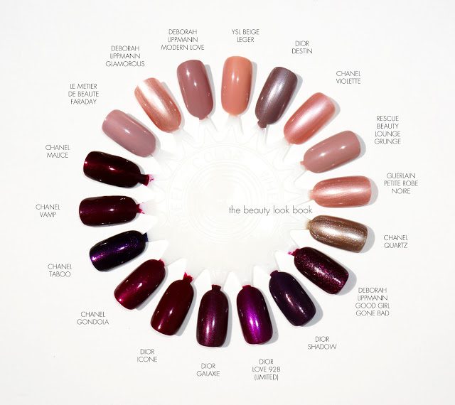 More comparisons on the full nail wheel in different light: Deborah Lippmann Good Girl Gone Bad, Dior Shadow, Dior Love, Dior Galaxie, Dior Icone, Chanel Gondola, Chanel Taboo, Chanel Vamp, Chanel Malice, Le Metier de Beaute Faraday, Deborah Lippmann Glamorous Life, Deborah Lippmann Modern Love, YSL Beige Leger, Dior Destin, Chanel Violette, Rescue Beauty Lounge Grunge, Guerlain Petite Robe Noire and Chanel Quartz.