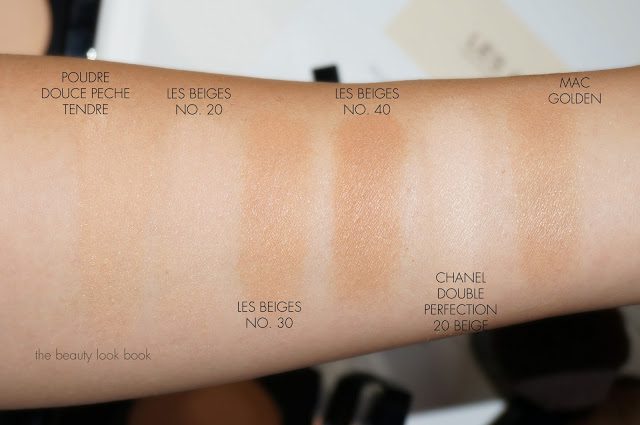 Below you can see that the Double Perfection Lumiere in 20 Beige has significantly more coverage than the Les Beiges powders and that in general the darker Les Beiges powders are quite a bit warmer in undertone. They aren’t quite as brown as MAC Golden Bronzer (which also has more of a glow at a cheaper price) but Les Beiges have a similar natural finish.