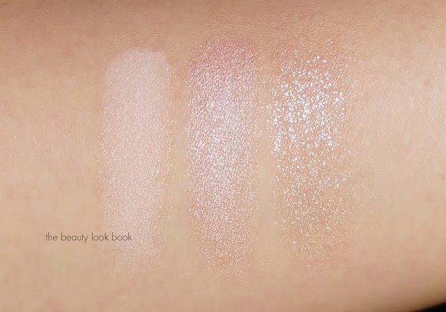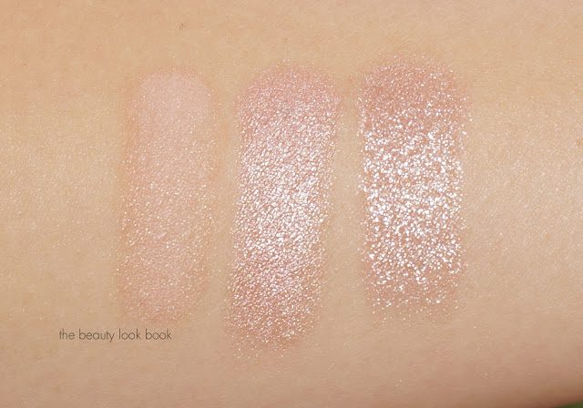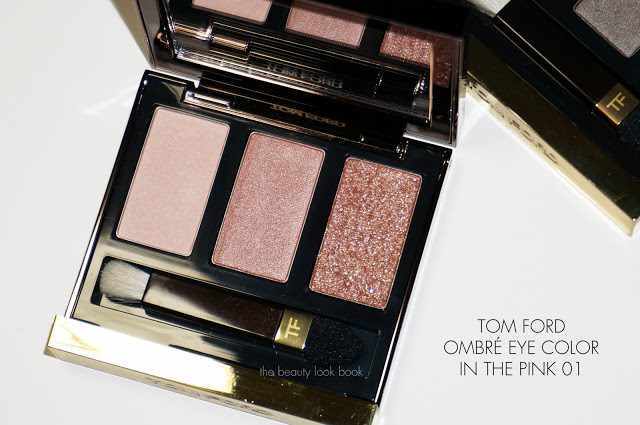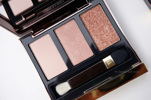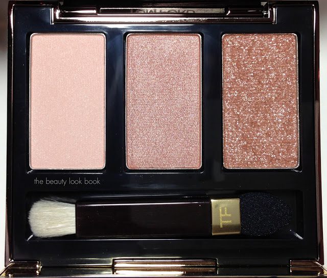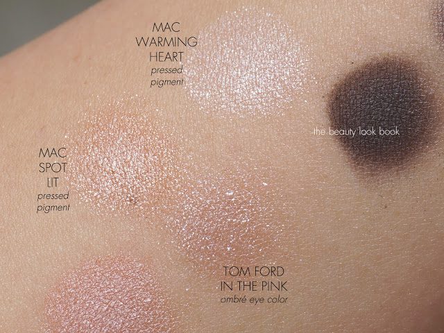 Update: Per request, here’s a quick comparison of the MAC Pressed Pigments in Spot Lit and Warming Trend (both discontinued, but other Pressed Pigment shades here) compared to the glittery shade in Tom Ford In the Pink. While the shadows are similar in concept, the Tom Ford is a bit more wearable because it has a sheerer base. The MAC Pressed Pigments have more frost and pigment in the base which gives a more glitzy eye look. There can be some fall out with the MAC pressed pigments while I personally experienced no fall out with the Tom Ford trio.