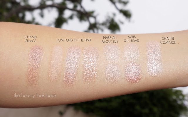 Although In the Pink is a neutral with similarities to many other pink shimmers, the combination of pinks in this palette are just gorgeous. There’s enough pigment in each shade and enough warmth/color so they do look different on the skin. Some mono-chromatic palettes tend to have colors that look different in the pan but all the same on the skin. In the Pink has enough variance with each color to stand out (at least on my skin). You can get a similar effect with other colors. I pulled a few to compare, below you can see Chanel Sillage, NARS Silk Road, Nars All About Eve, and Chanel Complice (all still available).