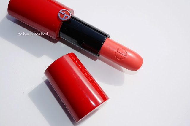 Armani has released a new formula of lipstick called Rouge Ecstasy ($34 each for 4.2 ml/4g). There are 36 different shades encased in a drop-dead gorgeous bright red magnetic-capped tube. I was drawn to all the peaches the first time I tested these. The first color I picked up was Heat #304 a bright coral-pink. The Rouge Ecstasy lipsticks are thick in texture with a slight tacky feel when you apply. They don’t glide on easily but they don’t really tug at the lips either. The texture makes the color adhere well to the lips helping it last longer than most Armani lipsticks. The color is easily layerable. Swipe the tubes on the lips a few times, allow to sit and then press the lips together to blend the color and the lipstick then feels weightless but moist. There is a very soft lipstick rose scent – it’s not noticeable when you apply though.