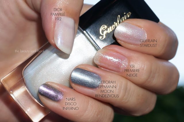 Comparison swatches below to Dior’s Spring Pampille, YSL Premiere Neige, Deborah Lippmann Moon Rendezvous (review here), and NARS Disco Inferno (review here).