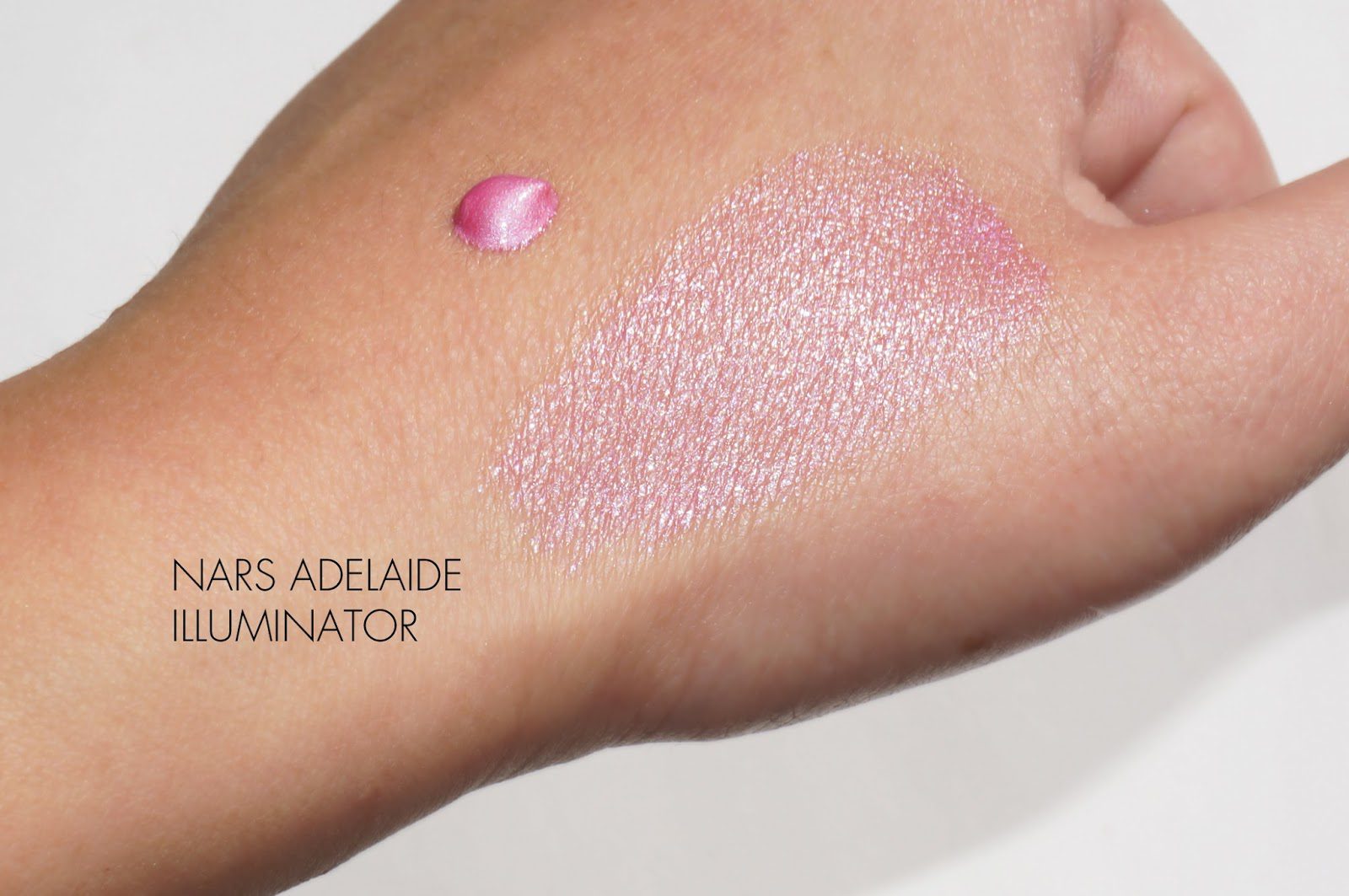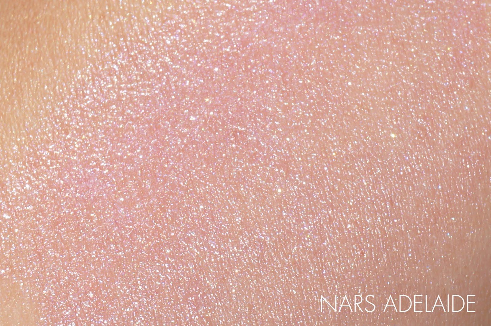 NARS Adelaide Illuminator ($30 for 1.1 oz/30ml) has been on my radar for several months. I saw some sneak peeks on Specktra and almost died of excitement when I found out there would be a shimmery pink highlighter. Adelaide is currently exclusive to Nordstrom with an official release date of February 1st. As many others have noted, Adelaide is a very shimmery pink and almost glittery. I usually do not like glitter on the cheeks but this illuminator is almost like a grown-up version of glitter. I have to use sparingly and swipe it lightly over powder blush to give a highlight. I found it lasted all day over a powder blush – right now my skin is normal but slightly dry. There was no shimmer or glitter fall-out. It stayed put on the skin from morning to night. If you don’t like any sign of glitter on the cheeks you may want to try Giorgio Armani Fluid Sheer #8 instead which is similar but paler in color (scroll down for swatches).