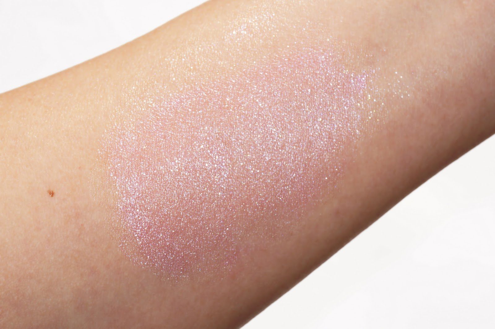 Swatched below you can see that Adelaide blends out to a cool sparkly pink on my olive skin. For me it’s pigmented enough to wear as a very soft blush but I prefer to layer over a powder blush with a very light layer.