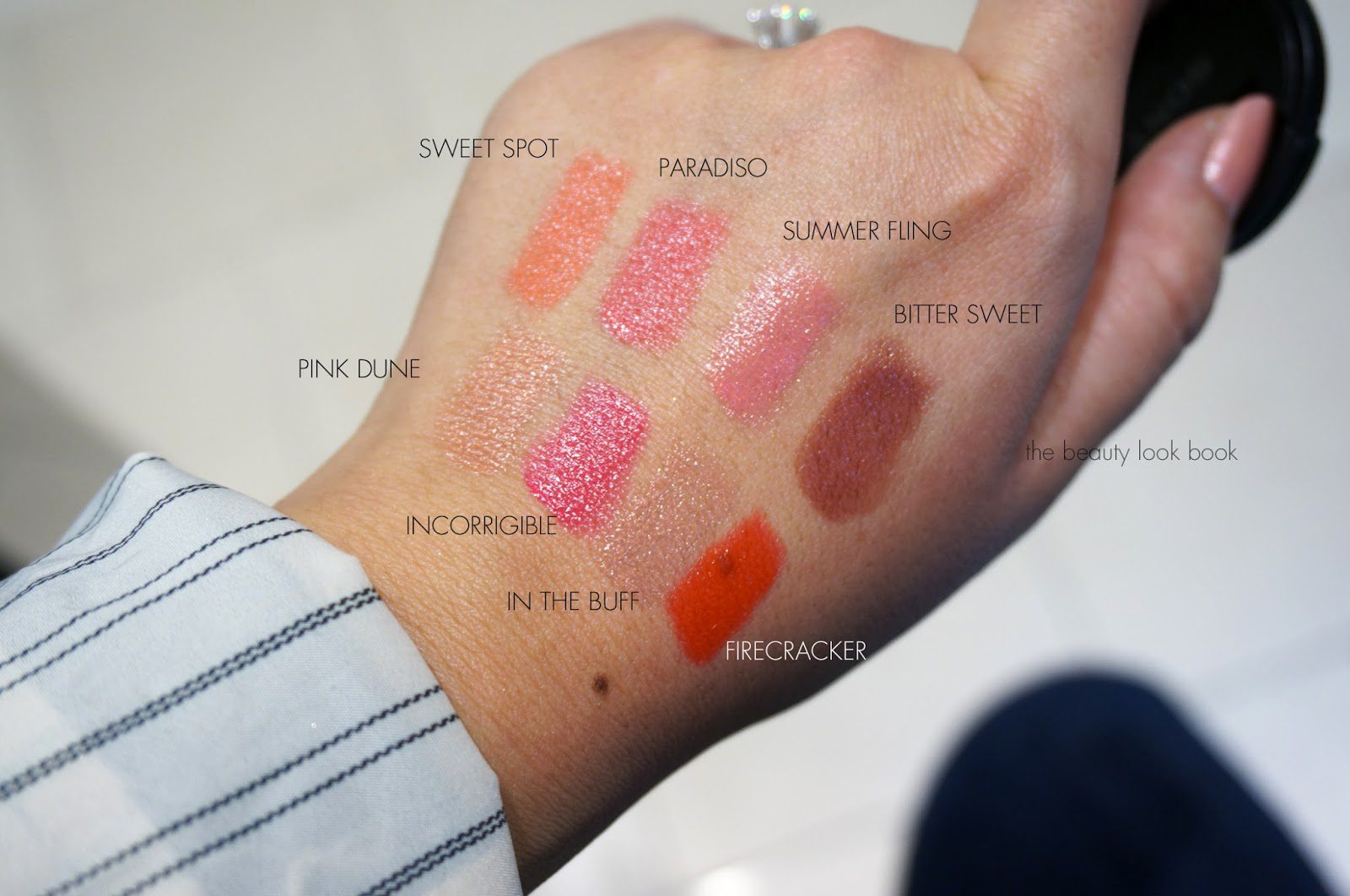 The colors swatched indoors with counter lighting and also outdoors to help you get a sense of how the colors look. For skintone reference I use the Tom Ford foundation sticks in 4 and 5 and am usually a Chanel B30. The color offerings: