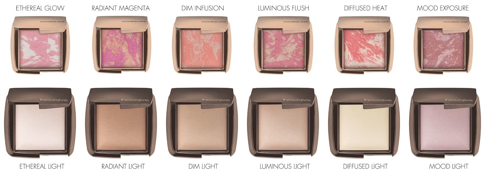 For reference I put together a collage on all the shades for you to see how each blush has a mix of each corresponding with a particular highlighter. Although I already own a number of the Hourglass Ambient Light highlighters, I do think these blushes are unique enough to justify owning.