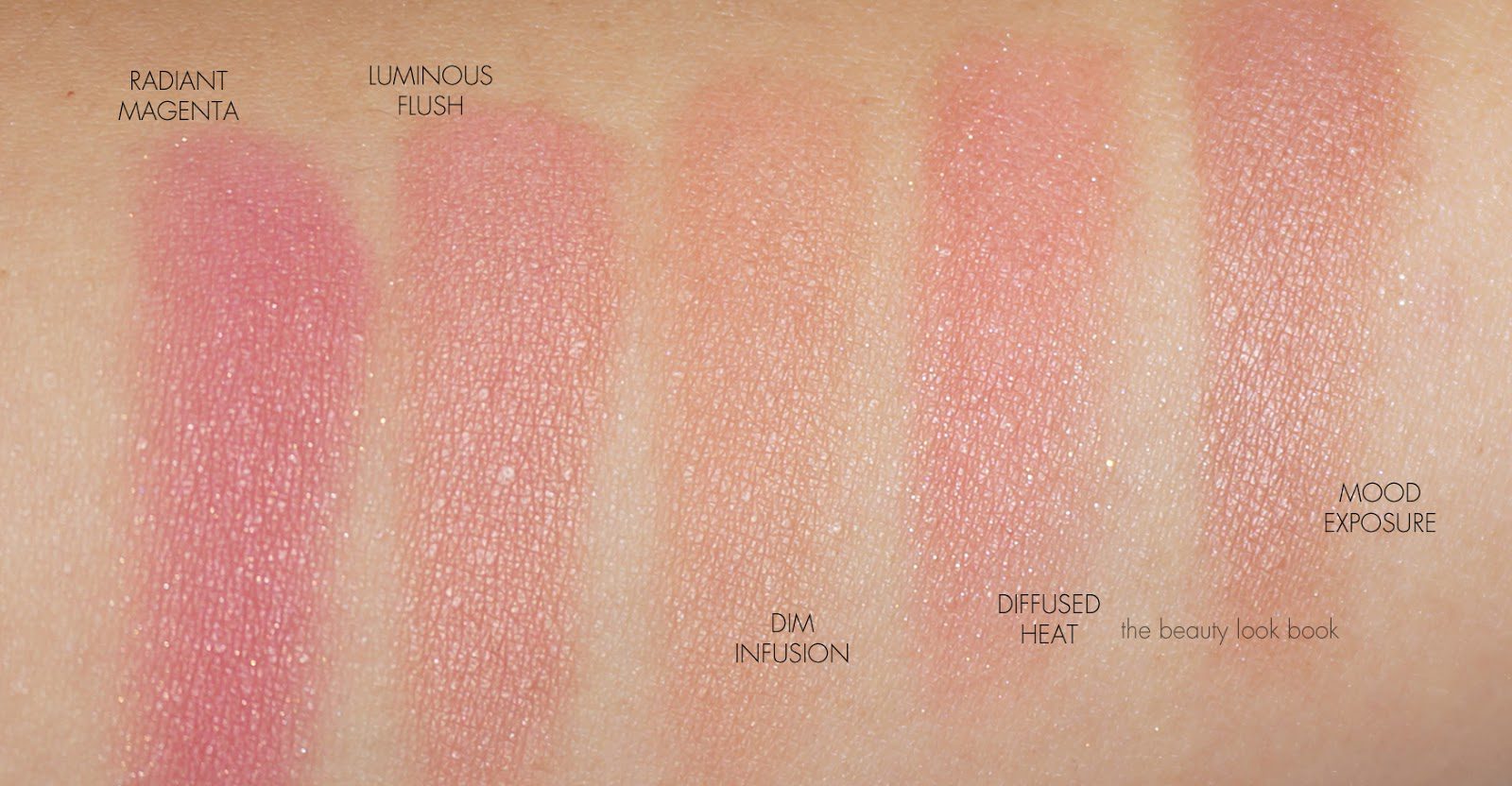 Dim Infusion is one of the lighter colors. It’s a subdued coral blush fused with Dim Light to add warmth. I found it showed up quite well on my skin, it gives a soft peach glow. Looks fairly light but I recommend you test in store if you can. I think it will show up on medium-tan skin, but may look nearly invisible on darker skintones. I’ve noticed from some comments that those with very fair skin found this did not show up on them. It might be one of those shades that shows up better if you’re skin does not match the Dim Light powder. If it does, this may just blend in with your skin and disappear. If you’ve tested this please share your thoughts in the comments.