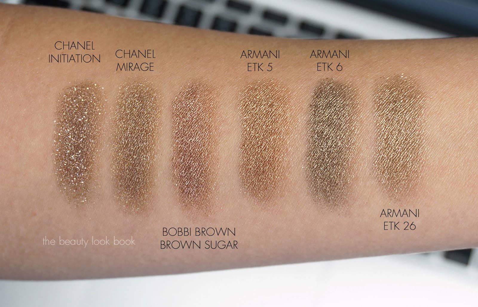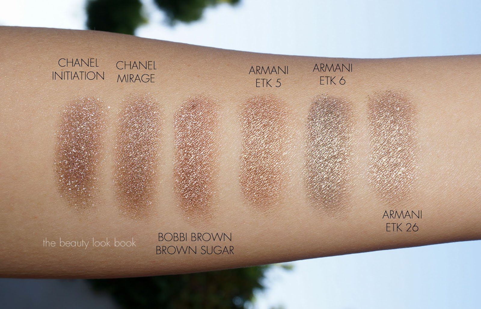 Chanel Initiation, Chanel Mirage, Bobbi Brown Bronze Sugar, Armani Eyes to Kill 5 Gold Blitz, Armani Eyes to Kill 6 Khaki Pulse and Armani Eyes to Kill 26.