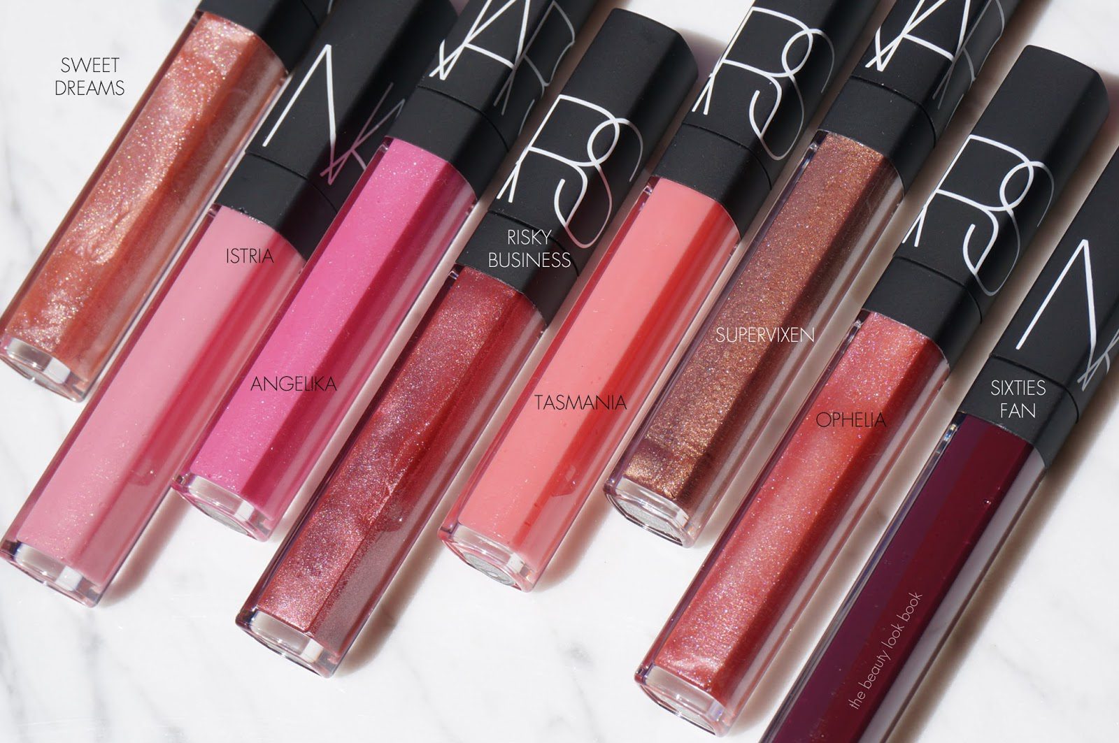 Here are the lip swatches of my NARS Lip Gloss picks, left to right include Sweet Dreams, Istria, Angelika, Risky Business, Tasmania, Supervixen, Ophelia and Sixties Fan. (Descriptions and arm swatches one post below.)