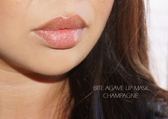 Champagne swatches like a gorgeous gold shimmer similar to MAC Nymphette Lipglass, but it sheers out on the lips to an almost clear tint. The Bite Agave Lip Mask gives the lips a healthy shine but virtually no color.