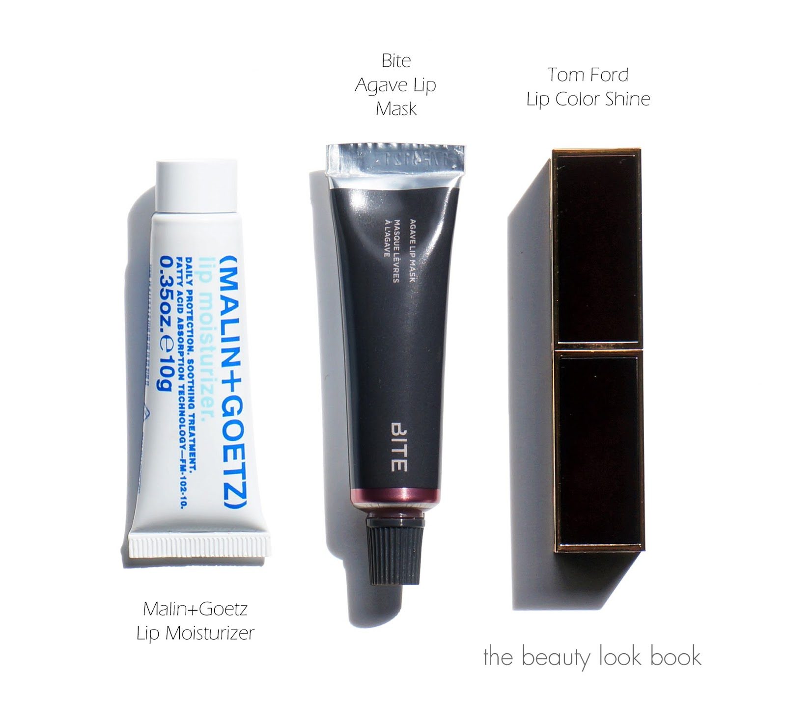 Size comparisons to Malin+Goetz Lip Moisturizer and a Tom Ford Lip Color Shine: