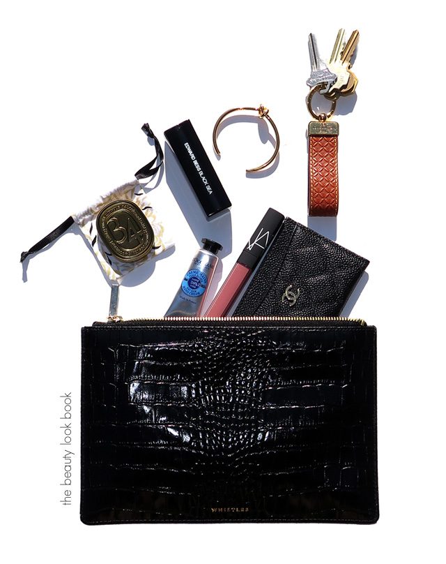 Clutch by Whistles, Edward Bess Black Sea Cream Wave Lip Tints, L’Occitane Mini Hand Cream, NARS Belize Lipgloss, Chanel card case, Celine cuff and Louis Vuitton Key Ring