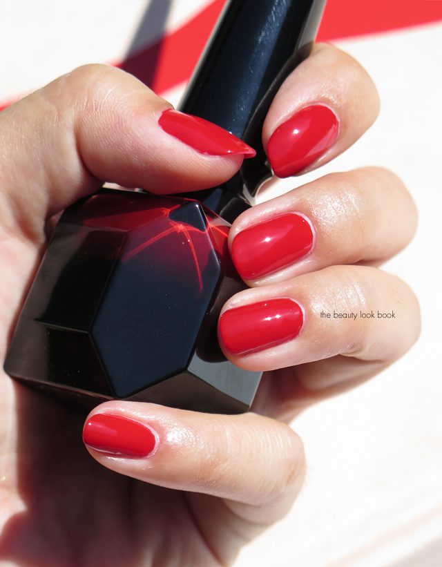 Louboutin Rouge is a deep rich red that matches the soles of the covetable Louboutin shoes exactly. I’ve found quite a few reds that come close or look pretty similar from arm’s length, but nothing I’ve tried matches it exactly. The formula is very fluid with super opaque coverage. You do need two coats though. With my first few tries I found the brush to be a bit challenging to work with. It’s a longer skinny brush which I found needed a bit of wiggling and angling to control. It is a softer brush which allows you to control it more. I’m used to the dense thick chiseled brushes that are goof-proof, so this one took a few tries but it does apply flawlessly on the nails. (I tend to be challenged when it comes to getting even application around the cuticles).