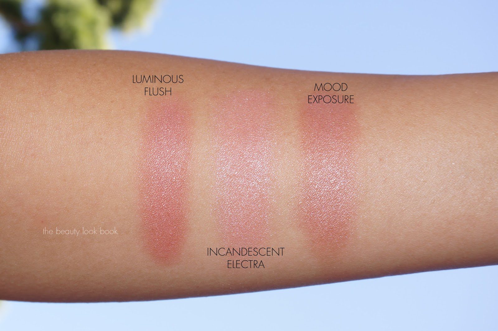Comparisons of the individual blush shades in Luminous Light and Mood Exposure (they look different in the pans but swatch identical):