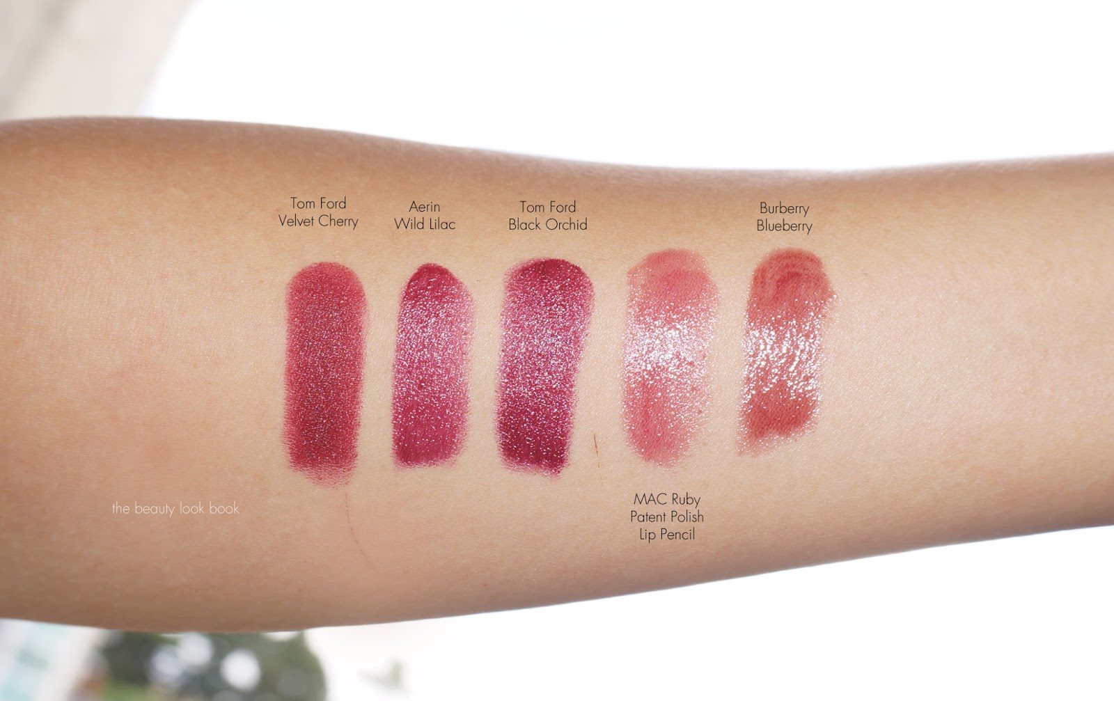 Set Two has Aerin Wild Lilac, Tom Ford Black Orchid (discontinued), MAC Ruby Patent Polish, Burberry Blueberry Lip Mist