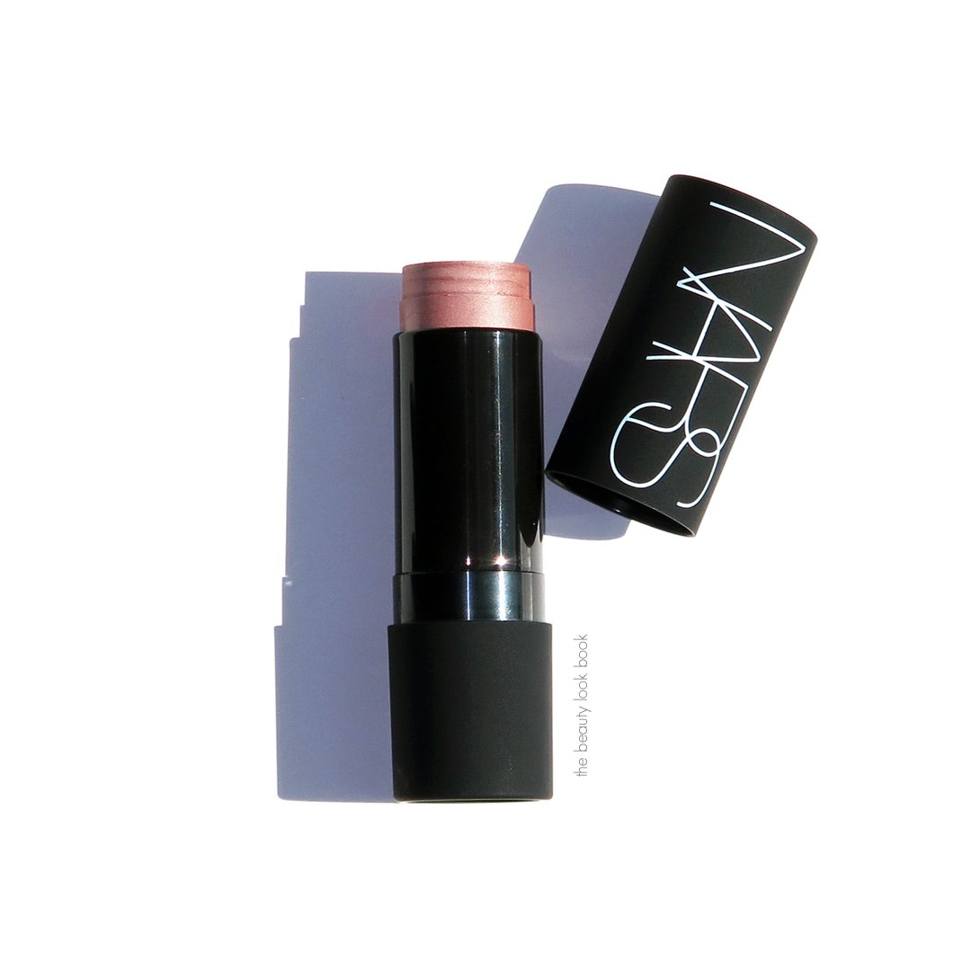 Last but not least is the new St. Lucia Multiple. This is a beautiful soft shimmering rose champagne. On my medium-toned skin it’s a highlighter color (I use the NARS Radiant Cream Compact Foundation and All Day Luminous Powder Foundation in Punjab), but I suspect on fair skin tones it will look more bronzey with more color. This one has a finely milled shimmer with a super smooth texture (no glitter). On my skin it’s light enough that I can wear it on the eyes without having to worry about getting that pink-eye look. On the cheeks it adds a very natural but visible glow to the skin. It’s really stunning. It’s a multi-dimensional color with lots of different colored shimmers in it. It has a rose base with champagne, silver, and pink shimmers that makes it glow. I found it sheer-to-medium in coverage. It’s not invisible on the skin, but it is on the sheer side for my particular skin tone. You can build the color naturally.