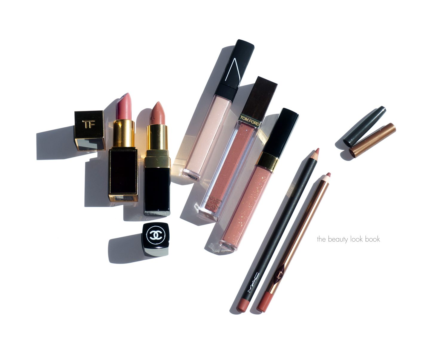Above from left to right: Tom Ford Lip Color Pink Dusk, Chanel Rouge Coco Adrienne, NARS Lip Gloss Guyane, Tom Ford Lip Gloss Rose Crush, Chanel Glossimer Sweet Beige, MAC Lipliner Boldly Bare, Charlotte Tilbury Lip Liner Pillow Talk