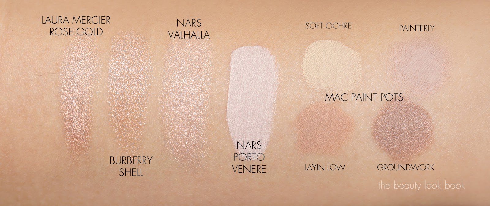 For nude eye bases, I typically prefer creams with a bit of shimmer. NARS Eye Paint in Porto Venere is a soft but pigmented nude powder pink that evens out the lids. If it seems to pale for you, MAC Paint Pots come in some good neutral matte cream colors. Above shown is Soft Ochre, Groundwork, Painterly and Layin Low.