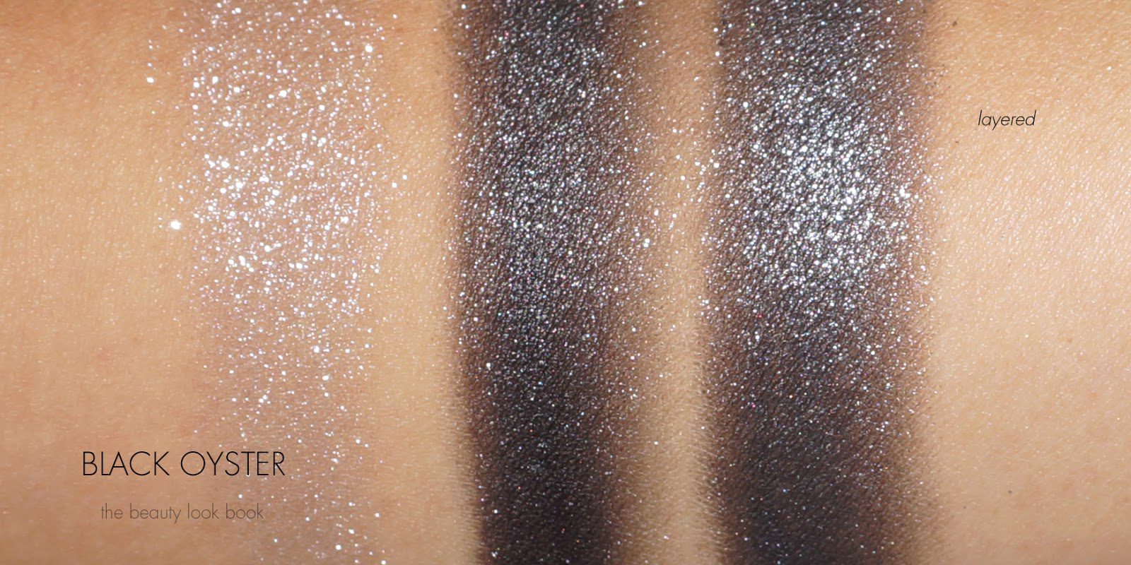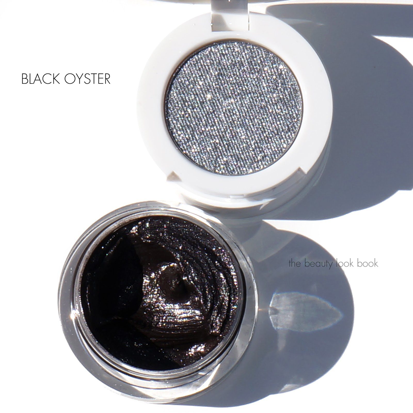 - Black Oyster has a deep complex charcoal cream shimmer with a silvery grey glitter powder