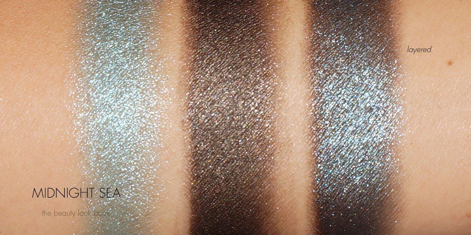 - Midnight Sea has a complex khaki/bronze/brown shimmer cream with an aqua teal glitter/powder