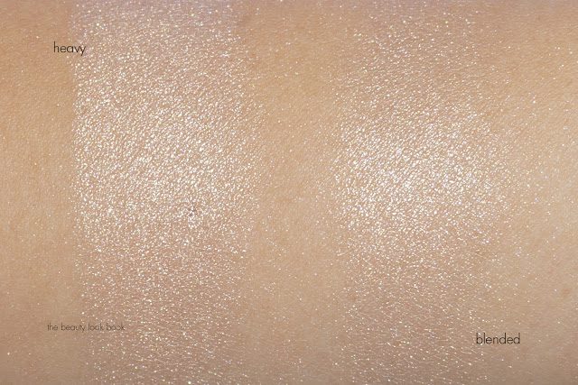 Bottom line a winner. I give it a huge thumbs up. The powder has a finely milled texture and although it is very shimmery and very pigmented it blends easily onto the skin. You only need a tiny bit to highlight the cheeks or eyes. I found lasting power to be quite good – it stayed put from morning to late evening and it adheres well to the skin. Since it is so pigmented I recommend using a very loose fluffy brush to apply on the cheeks. I’ve been using either a Stila Powder Brush (one I got years ago with the silver handle, I don’t think they make it anymore) or my MAC Duo Fibre Brush #187 to apply it. I didn’t experience fall out on the face since my skin was well prepped with a layer of serum, moisturizer and foundation. On my arm swatches I didn’t have any product so there was a bit of product that fell off my brush in a few fly-aways.