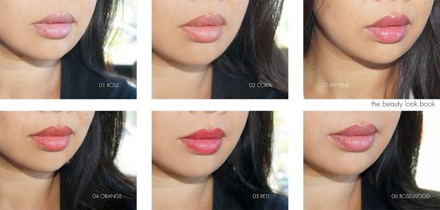 Swatches and close ups of all six shades. #03 My Pink is a self-adjusting shade adapts to the pH of lips – on me it turns into a rosy healthy pink. Note that the swatches on the arm for #03 is a light pink but on the lips it will adjust/brighten depending on your pH.