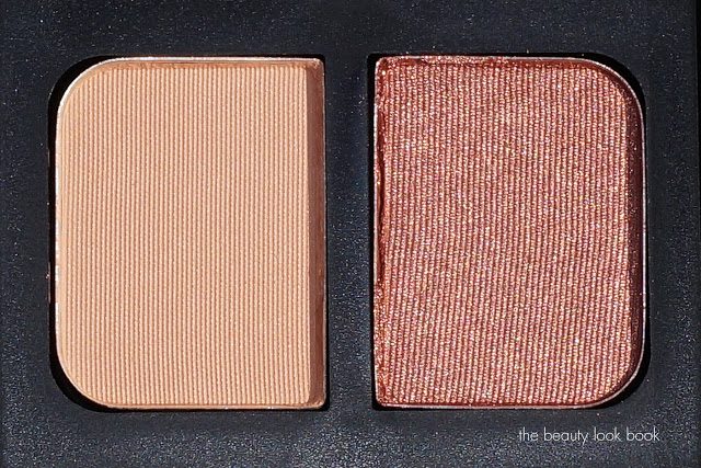 • Hammamet Eyeshadow Duo ($35, limited-edition) is soft satiny warm tan combined with a shimmering copper tan rose kind of shimmer, on my medium-olive skin this is too warm/dark by itself, but when layered with other shades it makes for a really great transitional blending kind of color, I have a hard time wearing any kind of copper color because they often pull orangey on me. Hammamet doesn’t pull orangey but it does pull very warm. I like layering this with Cordura and Alhambra Duos.