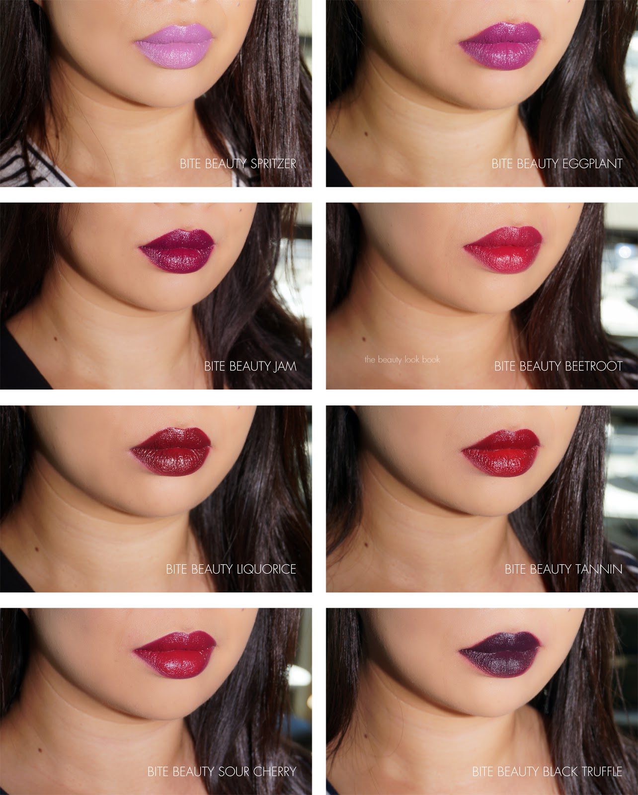 I have the last batch of the Amuse Bouche Lipsticks ($26 each, Sephora) lip-swatched in the cool-toned purples, plums and blue-based reds. Above left to right includes Spritzer, Eggplant, Jam, Beetroot, Liquorice, Tannin, Sour Cherry and Black Truffle. Out of all the colors, the only shade I had issues with was Black Truffle – but that is probably due to the sharp contrast the color has to my natural lip color. It was the only shade I found slightly patchy in application with one swipe. A few swipes evens out the color though. Swatches and descriptions of the colors: