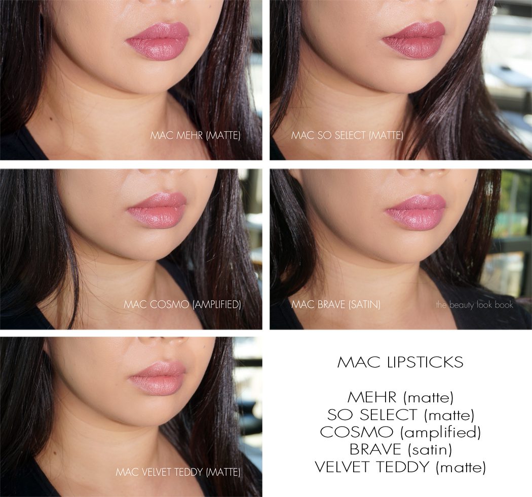 Swatch comparisons to a few other MAC Lipsticks (l to r) Mehr, So Select, Velvet Teddy, Cosmo and Brave, also Kat Von D Lolita shown next to it for reference:
