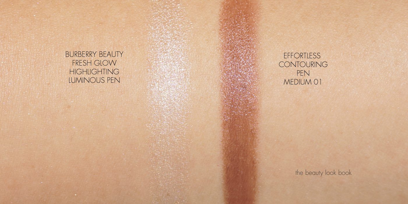 Up first are the Burberry Fresh Glow Highlighting Luminous Pen in Nude Radiance 01 and Face Contour Effortless Contouring Pen for Face and Eyes in Medium 01. In terms of a highlight the Burberry Fresh Glow Pen is on the sheer and subtle side. You will see a glow on the face if you highlight the cheekbones or eyes but it gives a luminous glow versus a more visible shimmer. The fresh glow highlighting pen comes in 1 shade, if you’re similar to my skintone or lighter the effect will be more subtle, but if you’re tan to deep there will be more contrast and it will show up better on your skin. Texture is creamy but dries down quickly. It is easy to blend before it dries down so you don’t have to rush.