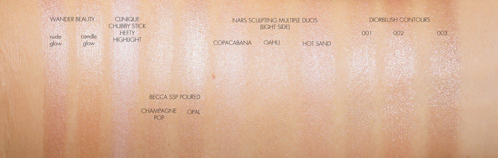 I couldn’t fit all the items on my arm so I split them between the contour side and highlighter side with a few added items to compare.