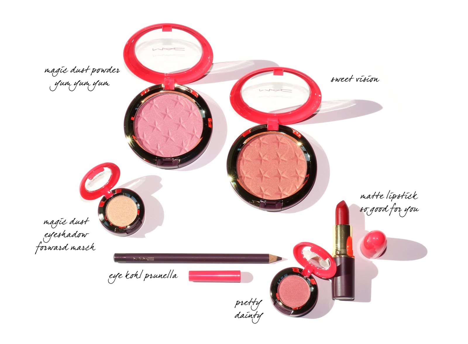 - Magic Dust Powder in Yum Yum Yum (c/o) is a soft sheer pink that gives the cheeks the prettiest hint of pink, it is on the sheer to medium side and the shimmer is very very fine so on the cheeks it’s more of a satin finish