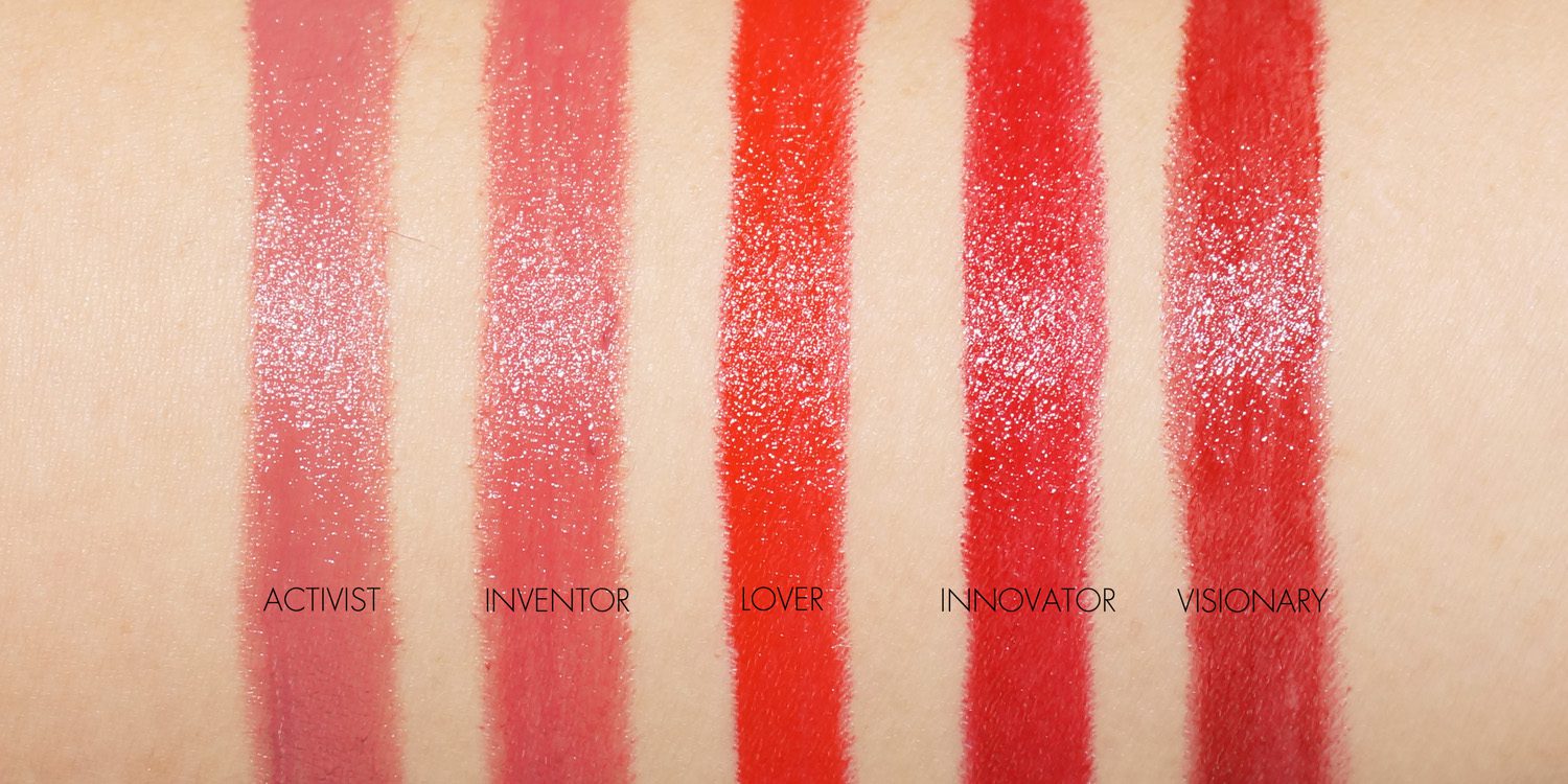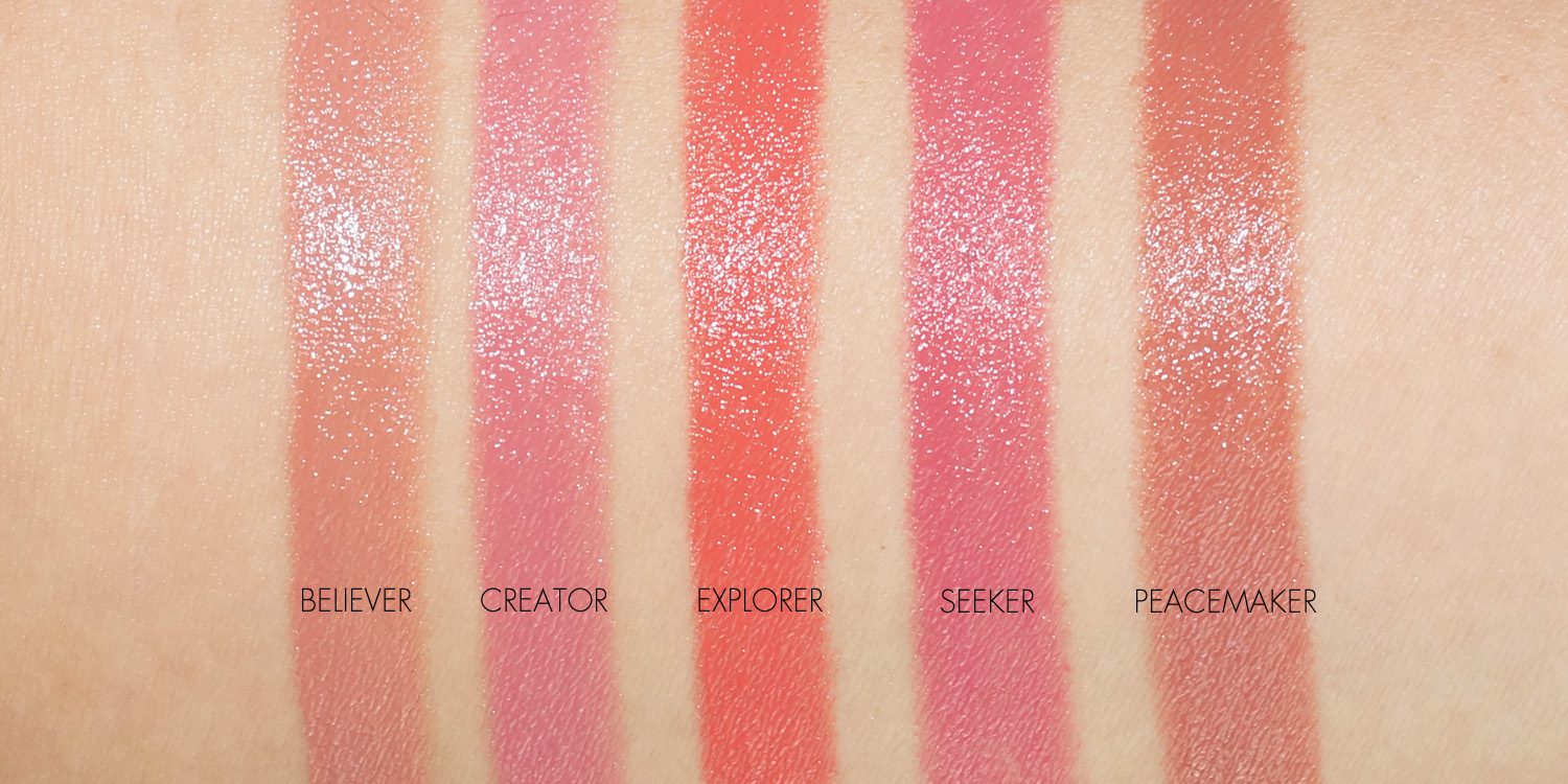 I swatched and photographed these in batches according to how they were displayed in the press box I received from Hourglass. Colors and descriptions detailed below. For the most part they all act and swatch like creams. I couldn’t detect any shimmer in these. Even though they are cream finishes they don’t look flat on the lips.